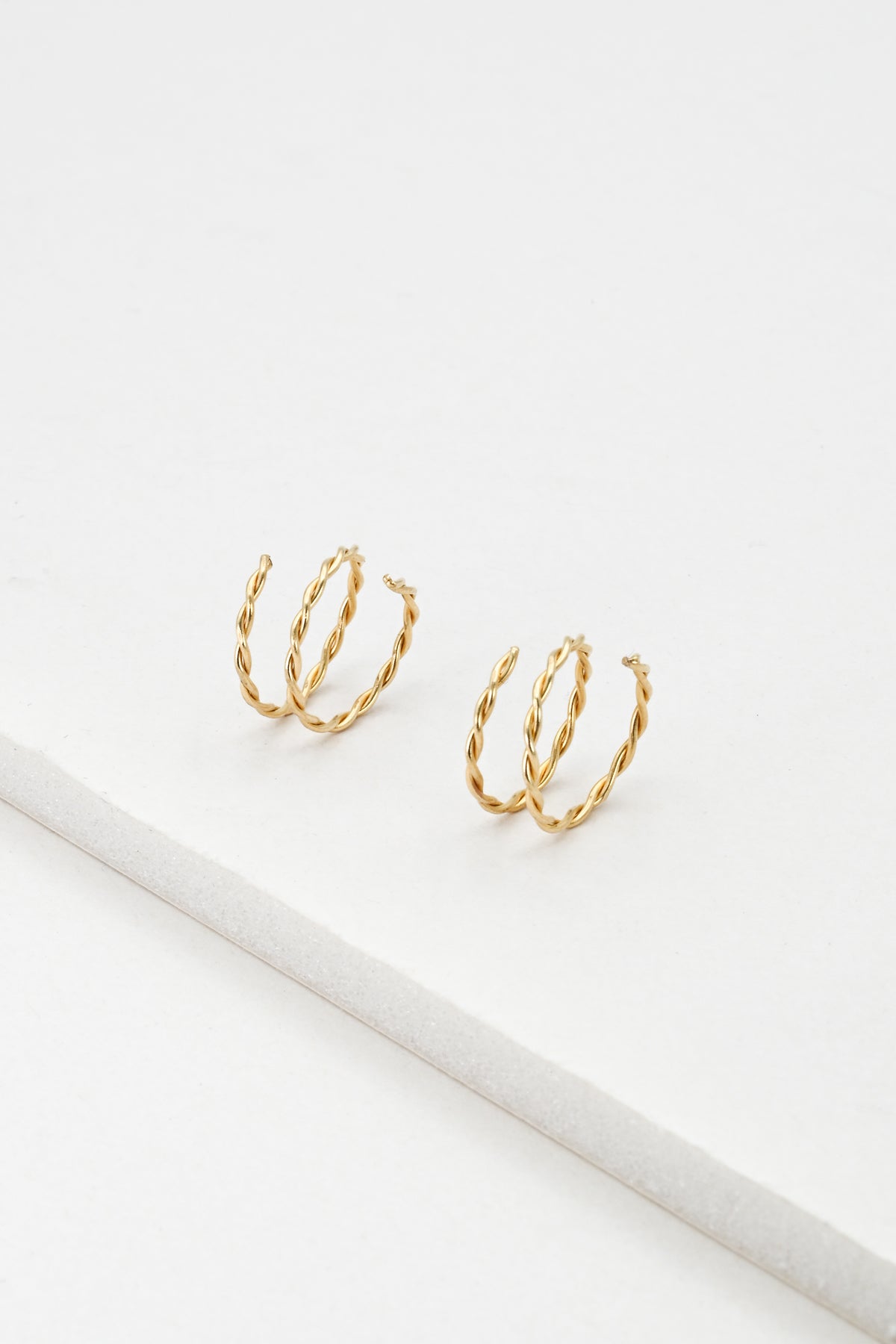 These gold "illusion" hoops screw into your ear piercing to give the look of a double hoop while only requiring one hole. Simply put one end through the hole and twist!