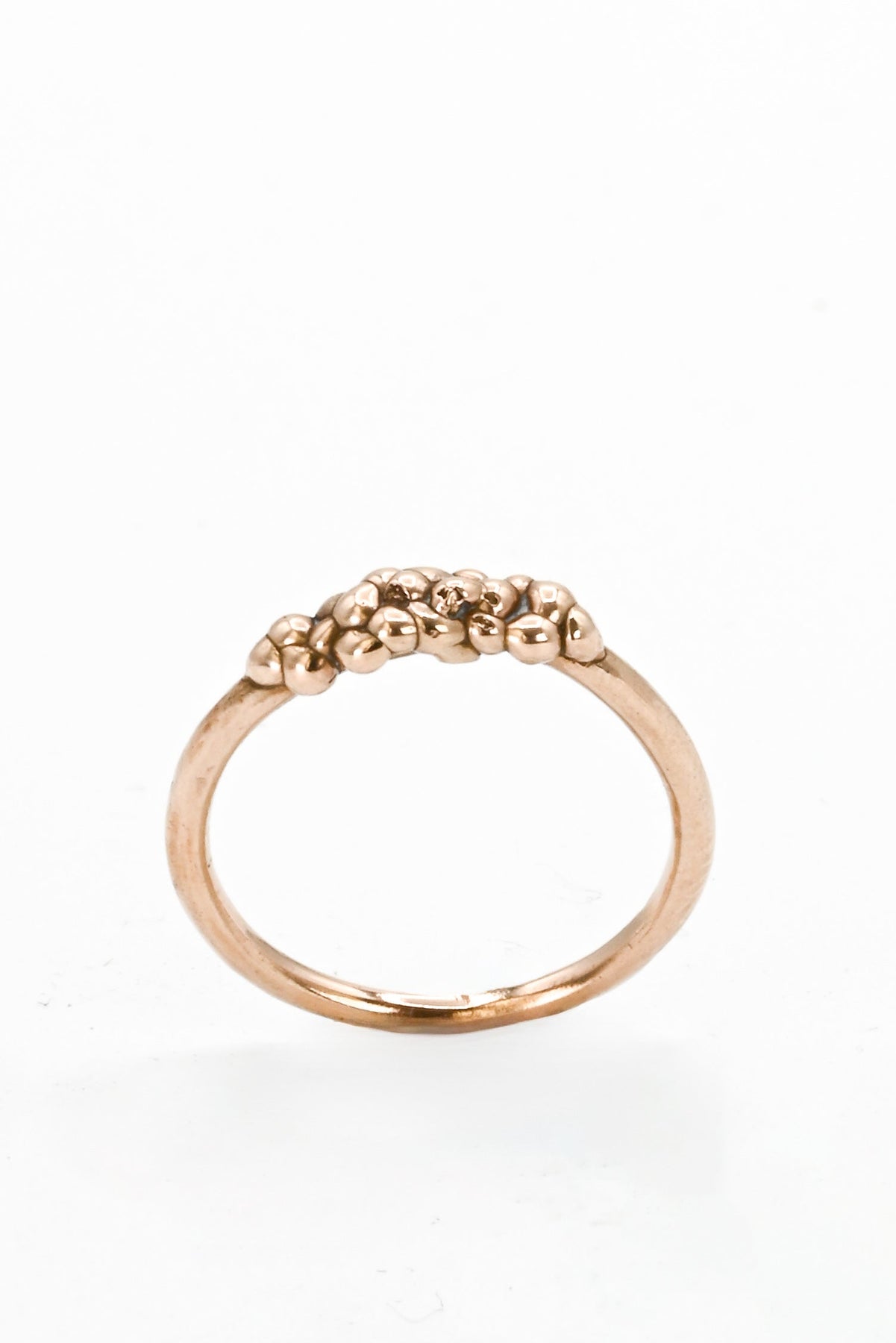 The "bubbles" on this ring come from the creation process: First it's sculpted in wax, altered with a hot tool to create the fluid texture, then cast into solid bronze.
