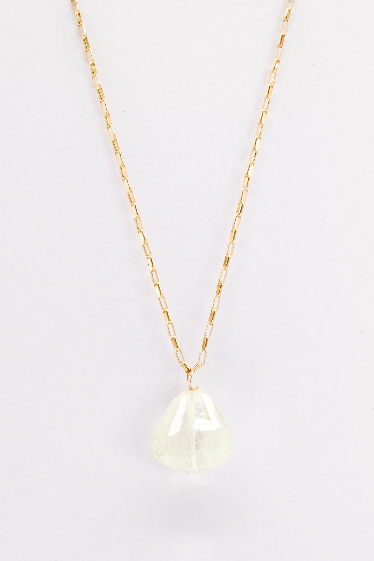A faceted light green aquamarine seems to float along a delicate gold chain. The chain adds texture to the look, with elongated box links.